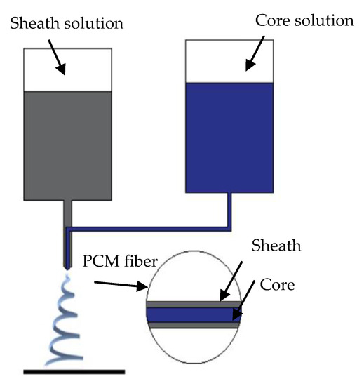 According to the literature, the most common encapsulation techniques are spherical encapsulation and encapsulation in fiber matrices [17,18,19]. The innovative encapsulation of PCM in the core of electrospun fibers is achieved through co-axial electrospinning. In co-axial electrospinning or two-fluid electrospinning, two different materials are electrospun simultaneously to form core-shell fibers. The co-axial electrospinning setup consists of two capillary tubes, two syringes connected to the tubes, an inner and an outer needle for the core and shell materials, respectively, a grounded collector, and a high voltage source, as shown n Figure 1. The electrostatic field forces convert the droplets of the feeding materials into charged threads of fibers. The electrospun PCM fiber matrix is an efficient encapsulation technique since no further encapsulation is needed. The high surface to volume ratio of the electrospun PCM fiber leads to an increase in the thermal conductivity.