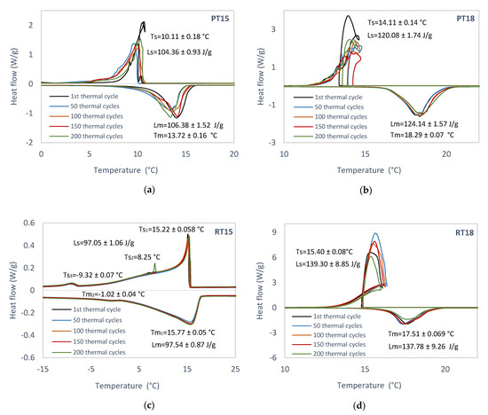 DSC thermogram of (a) PT15, (b) PT18, (c) RT15, (d) RT18 in 1st, 50, 100, 150, 200 thermal cycles. Obtained melting/solidification temperatures and enthalpies are shown.