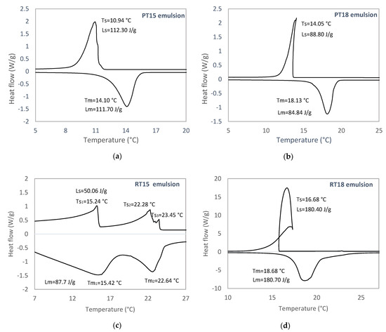 DSC thermogram of (a) PT15 (b) PT18 (c) RT15, (d) RT18 in water emulsions in their 1st thermal cycle. Obtained melting/solidification temperatures and enthalpies are shown.