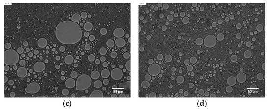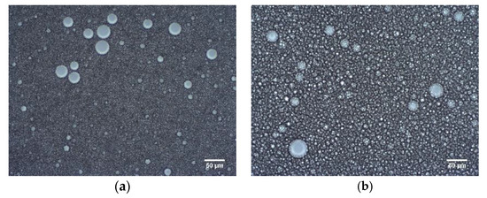 The PCM emulsion images were captured a few hours after sample preparation. Günther et al. [30] studied n-hexadecane emulsions with a size range of 0.1–20 μm. The average emulsion size given in Table 3 varied between 5 to 11 μm. The average emulsion sizes (Table 3) are over 1 μm, which characterizes them as thermodynamically unstable macro-emulsion systems. In all examined PCM emulsions, the emulsification process was conducted with the same percentage of PCM, water, emulsifier in the solution and the same energy input.