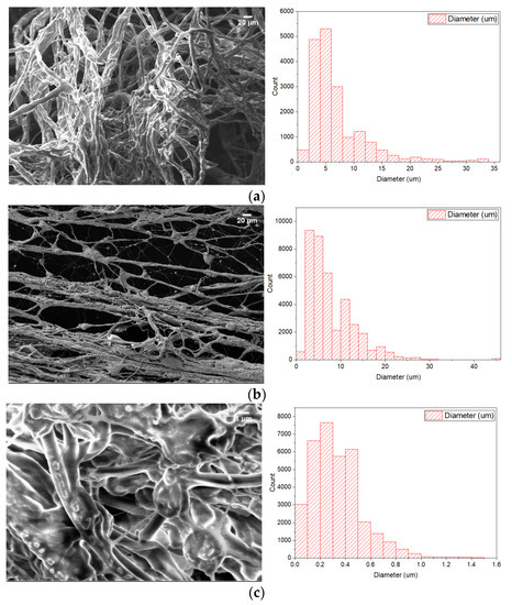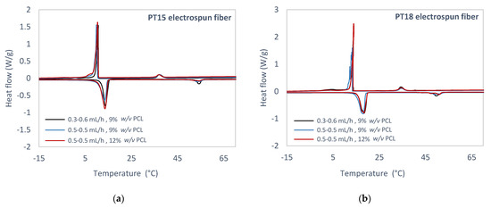 In the examined cases where the PCL solution concentration was below 9% and above 12% w/v, the PCM solution’s encapsulation could not be achieved. For a PCL solution concentration below 9% w/v, the jet broke up into droplets. The electrospun PCM fibers mean diameters in Table 5 indicate that the higher the PCL concentration in the fiber shell, the higher the fiber diameter in all cases except for RT15 in the 3rd case (shell solution concentration of 12% w/v). The encapsulation ratio, which varied between 41 and 80% for all fiber matrices, indicates successful encapsulation of the organic PCM compared to relevant literature [10,11]. The highest encapsulation ratios n were reached for PT15 12% 0.5–0.5 mL/h, RT18 9% 0.5–0.5 mL/h and RT18 12% 0.5–0.5 mL/h.