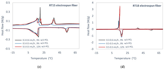 DSC thermogram of (a) PT15, (b) PT18, (c) RT15, and (d) RT18 in PCL shell electrospun fiber in 1st thermal cycle.