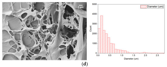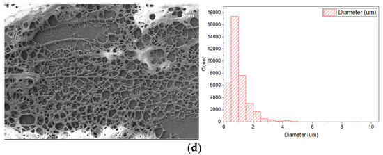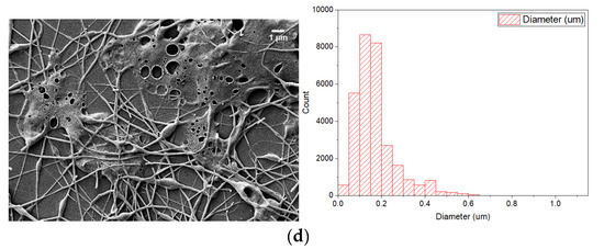 SEM figures of (a) PT15 9%PCL 0.3–0.6 mL/h, (b) PT18 9%PCL 0.3–0.6 mL/h, (c) RT15 9%PCL 0.3–0.6 mL/h, (d) RT18 9%PCL 0.3–0.6 mL/h.