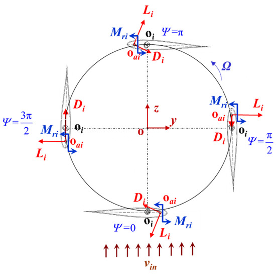 The lift force Li and drag force Di acting at the aerodynamic center oai of the i-th airfoil element in a rotating circle are shown in Figure 3. According to the positive regulations, the real direction of Li is opposite to that given in Figure 3, and the real direction of Di that is along the resultant wind velocity vri coincides with its positive direction. Expressions of Li and Di can be written as follows [22,39]: