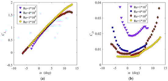 Symmetric airfoils are researched first, and the NACA0015 airfoil is used as an example. Figure 5 shows steady aerodynamic experimental results of CL and CD with respect to α at different Reynolds numbers for NACA0015 before stall, which were obtained by using the software Profili from steady aerodynamic experimental results (e.g., [39,40]). One can find that these curves have similar shapes in the region of small angles of attack; thus, they can be fitted to polynomials of the same form. CL-functions are odd, and CD-functions are even, approximately; hence, they can be expressed as the following polynomials with orders no more than four: