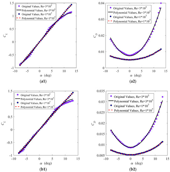 Comparison of original and polynomial values of CL and CD curves for symmetric airfoils: (a1,a2) the NACA0012 airfoil; and (b1,b2) the NACA0015 airfoil.