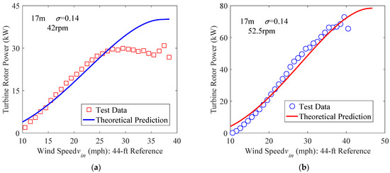 In order to validate the method and accuracy of results, the output power of the Sandia 17 m diameter Darrieus VAWT [2] is calculated. The present theoretical predictions are compared with the test data [2] for zero-pitch setting by selecting two experimental rotational speeds: (1) Ω = 42 rpm (Figure 9a) and (2) Ω = 52.5 rpm (Figure 9b). Variation of power with the incoming wind speed vin at the 44 ft (13.4 m) height is presented. The comparison shows a good agreement of the predicted results here with test data for two cases except some differences occurring in regions near peak values, possibly due to stalled flow or test error. Overall, the results in this work appear acceptable. As expected, the output power increases with the incoming wind speed, reaches the maximum value, and then decreases with the wind speed when the turbine operates at a constant rotational speed. This may be attributed to stalled flow after reaching the maximum power value. As the rotational speed is increased, the maximum output power increases, because stalled flow takes place at a high wind speed. The maximum value of the power is the optimal power of the turbine at this fixed rotational speed. The power efficiency of the turbine can be improved by operating at the optimal rotational speed that corresponds to the optimal power for each specific wind speed. Figure 10 presents comparison results of Cp–λ curves derived from experimental tests and current analytical predictions; it shows that the two results coincide well.