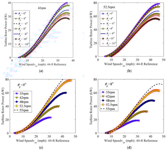 Performance of the Sandia turbine: (a) the influence of the pitch setting at Ω = 42 rpm; (b) the influence of the pitch setting at Ω = 52.5 rpm; (c) the influence of the rotational speed at θp = 0°; and (d) the influence of the rotational speed at θp = 8°.