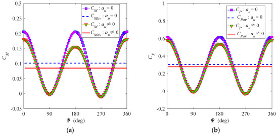 Blades rotate around the tower with a constant speed to obtain constant power in the region of rated wind speed. The performance of the turbine is influenced by the pitch setting, rotational speed setting, wind velocity, and solidity. A discussion of these effects is given by using the blade model. Figure 12 shows variation of the instantaneous torque coefficient CM (see Figure 12a) and instantaneous power coefficient CP (see Figure 12b) of the blade with respect to the azimuth Ψ at two sets of induction factors au = 0 (neglecting induced flow) and au ≠ 0 (considering induced flow), where the rotational speed Ω = 37.84 rpm, pitch angle θp = 0°, and incoming wind speed vin = 11.18 mph (5 m/s). Changing trends of both CM and CP are approximately harmonic when loss of wind energy (au = 0) is neglected, which are consistent with results in [3,8,13,15,16,17,20,26,32]. When induced flow (au ≠ 0) is considered, Figure 12 shows that both the torque and power of the turbine are reduced. The maximum values of CM and CP occur in the upstream direction Ψ = 0° (CM (0°) = 0.1799, CP (0°) = 0.5785) and downstream direction Ψ = 180° (CM (180°) = 0.1556, CP (180°) = 0.5388), respectively. Negative values of the torque and power appear near the positions Ψ = 90° (CM (90°) = −0.002632, CP (90°) = −0.007896) and Ψ = 270° (CM (270°) = −0.01053, CP (270°) = −0.03158). The minimum values of CM and CP occur at Ψ = 90° and Ψ = 270°, which are much smaller than the maximum values. Two regions of negative torques are small in this case. These analytical results agree with CFD results in [15,16,18,20,23,31].