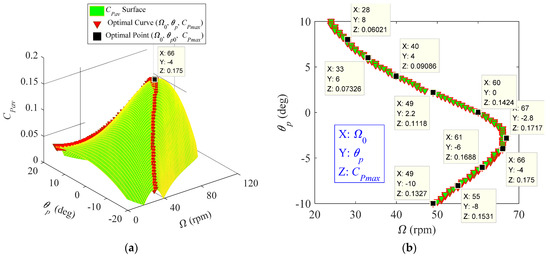 Variation of the power coefficient with the rotational speed and pitch angle at the fixed vin = 11.18 mph: (a) three-dimensional surface; and (b) two-dimensional projection of the optimal-power curve.