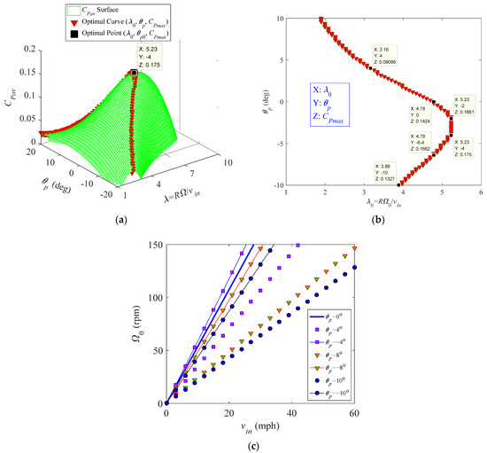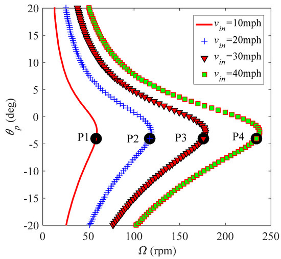 Figure 14 illustrates the optimal power coefficient curve (Ω0, θp, CPmax) at four wind speeds vin = 10 mph, 20 mph, 30 mph, and 40 mph, where P1 = (58.6 rpm, −4°, 0.175), P2 = (117.2 rpm, −4°, 0.175), P3 = (175.8 rpm, −4°, 0.175), and P4 = (234.4 rpm, −4°, 0.175) are the optimal points corresponding to four wind speeds, respectively. The optimal power coefficient CPmax is a constant 0.175 for each fixed wind speed. The optimal rotational speed increases with the wind speed for each fixed pitch setting; this is the case because increasing the rotational speed can reduce the angle of attack and avoid stalled flow in a high wind speed. This implies that increasing the rotational speed can extract more power at a high wind speed. Variation of the wind speed does not influence the optimal pitch setting (θp0 = −4°) because this pitch angle corresponds to the largest power coefficient CPmax = 0.175.