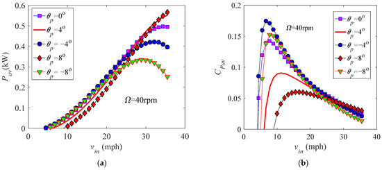 Variations of (a) the power and (b) power coefficient with the incoming wind speed for the fixed θp = −4°.