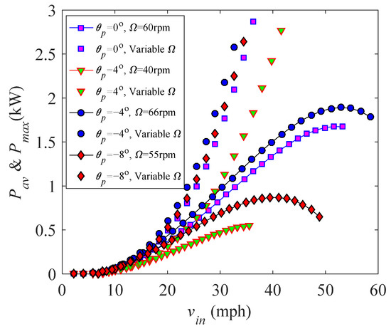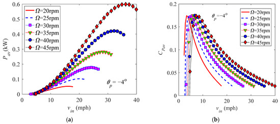 A fixed-pitch blade with a constant rotational speed cannot always reach the largest power output with change of the wind speed. Changing trends of the power Pav and power coefficient CPav with the incoming wind speed vin at different pitch angles and rotational speeds are illustrated in Figure 15 and Figure 16, respectively. Figure 15 presents the average power Pav (see Figure 15a) and power coefficient CPav (see Figure 15b) with the wind speed vin at five different pitch settings θp = 0°, ±4°, and ±8° for a constant rotational speed Ω = 40 rpm. It shows that, for each fixed pitch setting and a constant rotational speed, the power Pav increases first, reaches the maximum value, and then decreases with the increase in vin; this changing trend agrees with the experimental and numerical results in [2,6,33]. A larger power output and coefficient appear at θp = −4° at a low wind speed. However, the power decreases at a high wind speed because stalled flow is reached with a further increase in the wind speed. Turning the leading edge toward the tower can reduce the influence of stall; hence, the power output at a positive pitch setting (θp = 0°, 4°, and 8°) becomes larger than that of θp = −4°, and the maximum power for the pitch setting θp = −8° becomes smaller. Figure 16 shows the power Pav (see Figure 16a) and power coefficient CPav (see Figure 16b) at six different rotational speeds Ω = 20 rpm, 25 rpm, 30 rpm, 35 rpm, 40 rpm, and 45 rpm for the fixed pitch setting θp = −4°. One can see that using a higher rotational speed at a high wind speed can extract more power. The optimal rotational speed corresponding to the maximum power coefficient increases with the wind speed, which agrees with the results in Figure 14.
