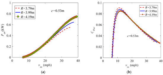 Effect of the rotor radius on (a) the power and (b) power coefficient, where θp = 4° and Ω = 40 rpm.