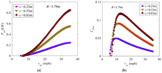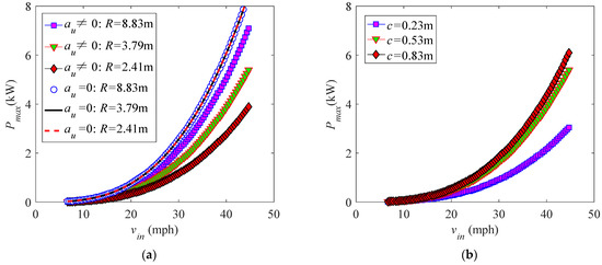 Influences of the rotor radius R and chord length c on the optimal power Pmax of a variable-speed blade with the fixed pitch setting θp = 0° are revealed in Figure 20, where the rotational speed has been set to satisfy the variation rule at the zero pitch. Figure 20a shows variation of Pmax with vin for three rotor radius settings R = 8.33 m, 3.79 m, and 2.41 m at the fixed chord length c = 0.53 m. One can see that increasing the rotor radius cannot change power extraction if induced flow is neglected (au = 0), which is the case because increasing R can decrease the optimal rotational speed and increase the torque at the same time. However, when induced flow is considered, the power output of the blade can be improved by extending R because increasing the rotor radius can reduce the influence of induced flow. Figure 20b presents variation of Pmax with vin at three different chord length selections c = 0.23 m, 0.53 m, and 0.83 m for a fixed rotor radius R = 3.79 m. It can be found that increasing the chord length can enhance the power of the blade; this is the case because extending the chord length can increase the torque of the blade without changing the optimal rotational speed.