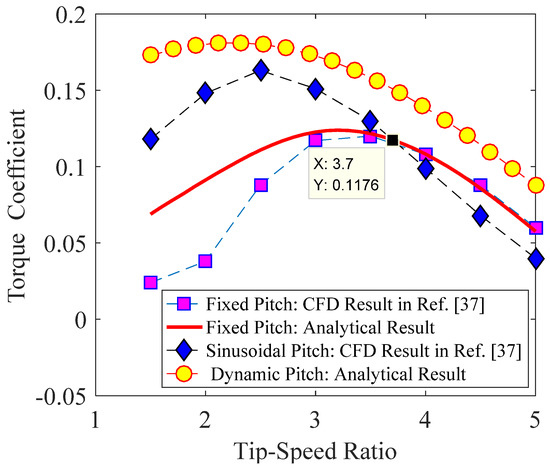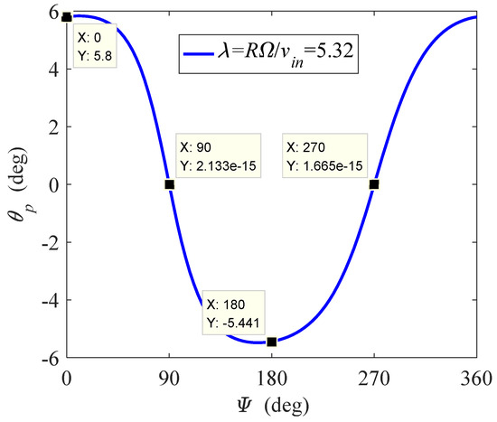 The performance of a VAWT can be further improved by adopting a dynamic-pitch method. In this section, the dynamic-pitch optimization is discussed using a theoretical method. One can consider the instantaneous torque at each fixed azimuth as a function of the pitch angle, i.e., Mi = Mi (θpi). The optimized pitch angle at each azimuth can be obtained by solving the maximum value problem of the torque function. This means that the conditions and hold at the optimized pitch angle. One can first consider the symmetric airfoil and approximate functions of Equation (9). By denoting , the optimized pitch angle is analyzed for the following two cases:
