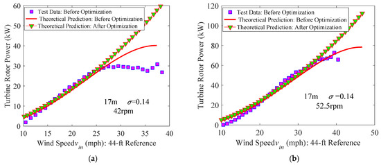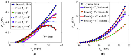 The influence of pitch setting on the power is discussed according to theoretical predictions by selecting seven pitch angles θp = 0°, ±4°, ±8°, and ±10° for two constant rotational speeds Ω = 42 rpm (Figure 11a) and Ω = 52.5 rpm (Figure 11b), where “±” denotes directions of the pitch angle (“+” stands for turning the leading edge toward the tower). The largest value of the power appears at θp = 0° for each fixed rotational speed and fixed wind speed, which implies that the optimal pitch angle is near zero for this turbine. The direction of the pitch angle has little influence on the output power of the turbine at a low wind speed; this is the case because the natural angle of attack (no pitch setting) at each azimuth is very small (see Equation (3)), and the torque is symmetric about the zero pitch when the pitch setting is considered. However, the natural angle of attack corresponding to the zero pitch becomes large at a high wind speed. Thus, setting the same pitch at two different directions brings two different angles of attack; this can influence the output of the power. This reveals that using a negative pitch (i.e., putting the trailing edge toward the tower) can extract more power than setting the same positive pitch. This is the case because a negative pitch setting can reduce the angle of attack and influence of stalled flow. The power at each fixed wind speed is reduced by setting a large pitch angle, which is the case because a larger pitch is prone to introducing a larger angle of attack and causing stall of a blade. The influence of rotational speed setting on the power of the turbine with a constant rotational speed is analyzed by taking five constant rotational speeds Ω = 35 rpm, 42 rpm, 48 rpm, 52.5 rpm, and 55 rpm for two fixed pitch settings θp = 0° and 8°. One can see that the optimal rotational speed that corresponds to the maximum value of power increases with the wind speed; thus, increasing the rotational speed at a high wind speed can extract more power. However, the wind speed needed to start the wind turbine increases somewhat with a higher rotational speed.