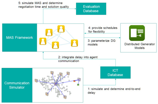 The experiments are conducted with a simulation environment whose architecture is shown in Figure 2. It consists of 5 components: an agent framework, DG simulation models, a database, a communication simulator, and an evaluation database. For communication simulation, we choose EXata (https://www.scalable-networks.com/products/exata-network-emulator-software (accessed on 2 December 2020). In EXata, the communication scenarios are implemented as models consisting of end systems (agents) representing DGs and the infrastructure in between (base stations, switches, etc.). The communication between agents is simulated and the end-to-end delay between a sending and a receiving agent is measured in this simulation. Delays of all end-to-end connections are stored into the ICT database.