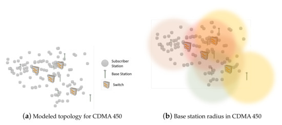 Therefore, we consider CDMA 450 and LTE Advanced as very promising transmission technologies for our use case. CDMA 450 uses code division multiplexing for channel separation (CDMA)—a technology used in 3G mobile networks [4,24]. It offers good obstacle penetration characteristics, sufficient throughput, and low capital expenditure due to long communication distances, and therefore fewer base stations. This transmission medium can be exclusively used for communication of the smart grid [23]. LTE communication is provided via the public network [23]. Therefore, capital expenditure is lower than with CDMA 450, as there is no need to build a separate backhaul network. The available throughput can be provided by the communication network operator through contractual service level agreements usually billed by transmitted data or used throughput. As a result, the operational expenditure is higher compared to CDMA 450.
