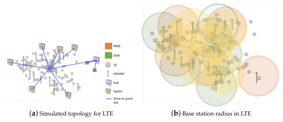 The network topology of CDMA 450 as shown in Figure 3 consists of six antennas connected via five switches. For LTE Advanced (Figure 4) we modeled a wired network consisting of a hub, a Serving Gateway (SGW), a Mobility Management Entity (MME) and 20 base stations (eNodeB) [30] which are connected to seven switches. This core network was connected to the User Equipment (UE) via a wireless network. The communication works on several frequency bands via carrier aggregation. Multiple-input and multiple-output (MIMO) allows parallel transmission of data with several base stations at the transmitter and receiver on the same frequency and at the same time by using several antennas in transmit and receive direction. The parametrization of base stations and UE for both technologies is shown in Table 4. These are standard values for both technologies in EXata.