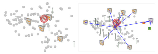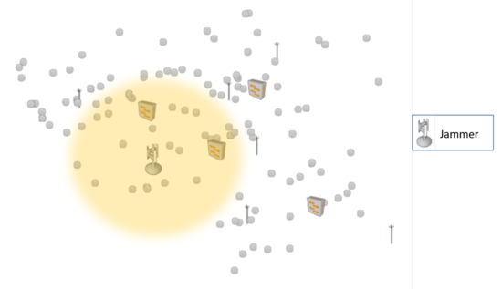 A traffic generator in EXata was then used to simulate additional message exchange in the communication network. It is implemented as an application in EXata, where a source node sends messages to a destination node. During the simulation, messages of 100,000 bytes are sent between a number of 79 randomly selected nodes per second to simulate increased network load. Disturbances within the communication networks were modeled as a failure of one of the transmitting base stations. For this purpose, we have chosen a centrally located, as shown in Figure 5. Due to the failure, increased throughput at the other base stations can be expected. To test the effects of interference phenomena, a centrally located jammer, as shown in Figure 6 was modeled, which transmits on the same frequency as the surrounding antennas.