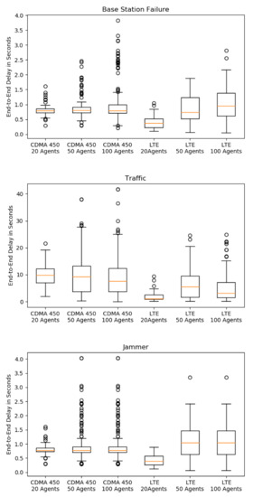 In order to determine the end-to-end delays between different agents for the different ICT-scenarios simulations were conducted. These simulations were performed in EXata. The results, i.e., the average end-to-end delays of ICT scenarios, are shown as box plots in Figure 7.
