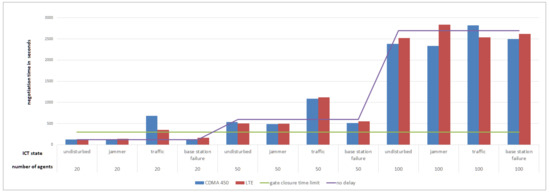 Communication disturbances may occur in various types and can be analyzed in a simulation, either steady-state or dynamically. We limit our scope for communication disturbances to a steady-state view, which means that disturbances occur before and continue throughout the simulation. For both communication technologies—CMDA 450 and LTE Advanced—we choose three types of disturbances. As a result, we consider four different ICT cases: