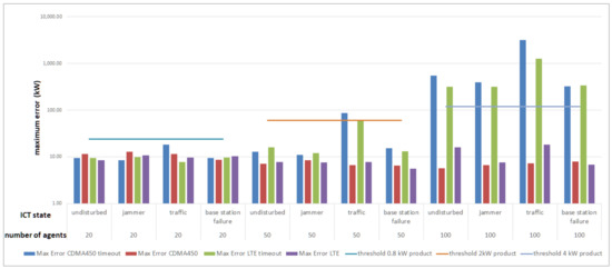 Figure 9. Maximum deviation of the solution to the target schedule for both communication technologies with and without negotiation time-out. From left to right: the scaled numbers of agents in the VPP for the different ICT scenarios. The accepted deviation from the respective products serve as thresholds.