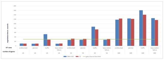 The scenarios of undisturbed communication serve as an orientation to which the disturbed ICT scenarios are compared. For undisturbed communication, the medians of the technologies are at about 0.8 s. The delay time for LTE with 20 agents is on average 0.5 s. The delay tends to increase with the number of agents as can be seen by the increasing dispersion. In some cases, delay of up to 3.5 s occur.