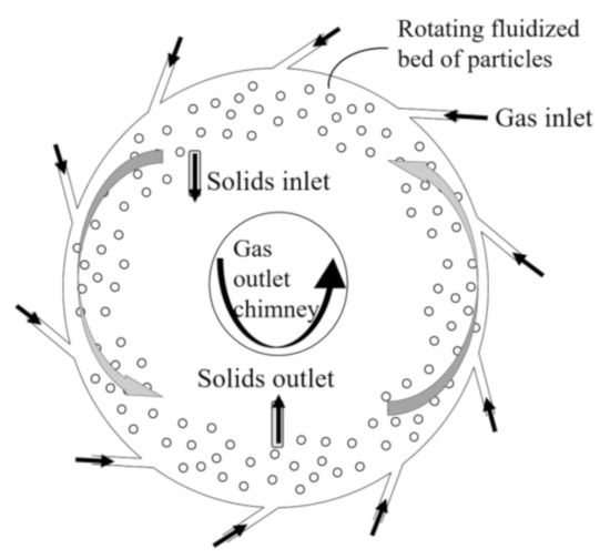 - Dutta, A.; Ekatpure, R.P.; Heynderickx, G.J.; De Broqueville, A.; Marin, G.B. Rotating fluidized bed with a static geometry: Guidelines for design and operating conditions. Chem. Eng. Sci. 2010, 65, 1678–1693. [Google Scholar] [CrossRef]
