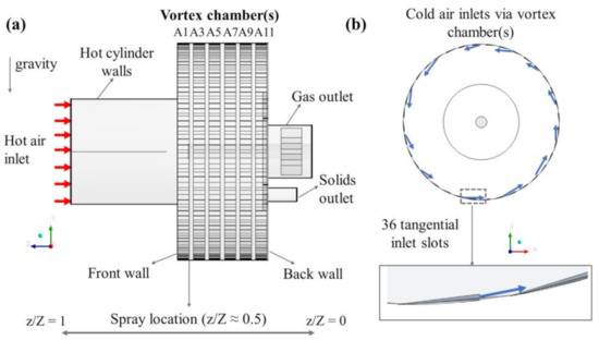 In this work, a novel application of spray drying in a RMD with vortex chambers located downstream of the hot air inlet is studied; see Figure 2 for details of the geometry.