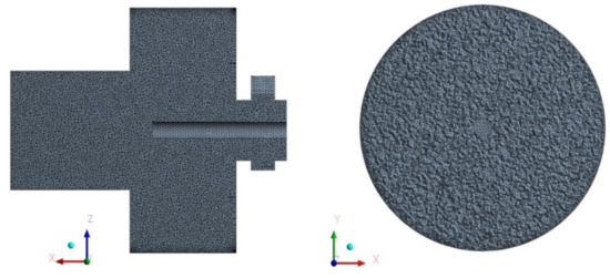 An unstructured tetrahedral mesh is used to discretize the geometry. In order to solve the flow field correctly near the small tangential inlets in VC, mesh refinement is done there. A grid-independent solution is verified by applying meshes with a resolution of 3M, 6M, and 9M elements and examination of three radial temperature profiles. The overall discrepancy between the solutions was found to be in the range of 1%; thus, for further research, a grid of 3M elements is used. The final mesh is presented in Figure 3.