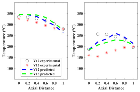 In order to assess the performance of the model, first, a validation study is performed. The numerical results are compared with the temperature profiles of experiments conducted without and with droplet spray, see Figure 4 (left) and Figure 4 (right), respectively. The thermocouples V12 and V13 are located in the central core region of VC, and they measure the temperature at each VC wheel in the axial direction.