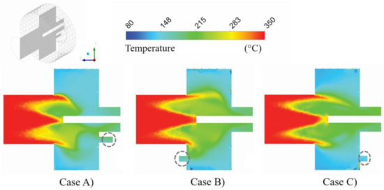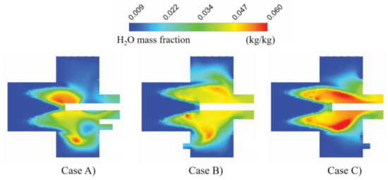 From Figure 7, it is possible to note an asymmetric behavior of the spray, i.e., the penetration depth, and thus also the temperature and moisture profiles are different at the presented cross-sections. For case “A”, the droplets cannot penetrate further into the hot zone; thus, the temperature and moisture fraction profiles are relatively uniform with minor heat and mass exchange (seen clearly in Figure 7c,d). The temperature and moisture fraction profiles for cases “B” and “C” show a temperature drop from 350 °C to approximately 120–130 °C and maximum moisture fraction values of about 0.095 kg/kg.