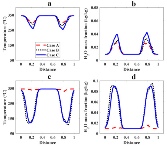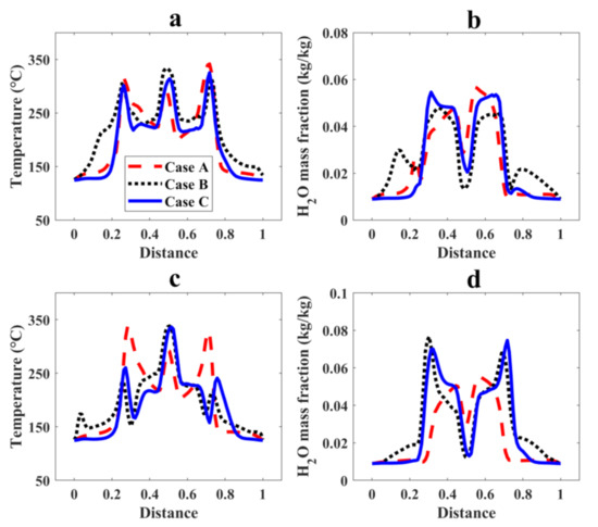 Radial temperature (a,c) and moisture (b,d) distribution at z/Z = 0.75 for centerlines of X-Z (a,b) and Y-Z (c,d) planes.