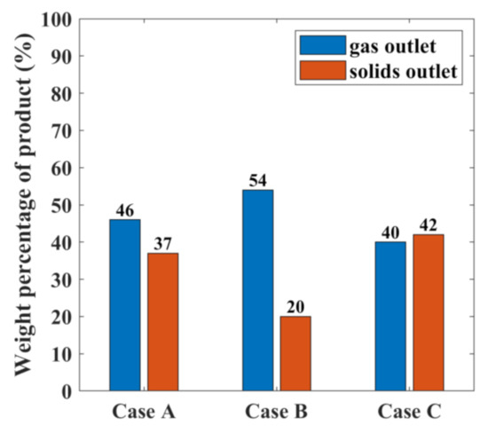 Comparison of weight percentage (%) of product recovered at the outlets for cases A–C.