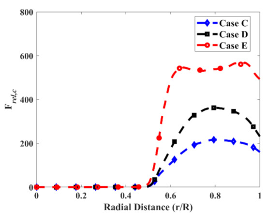 Comparison of average relative centrifugal forces along the chamber radius for cases C–E in the presence of droplets/particles at z/Z = 0.5. Here, r/R = 0 represents the centerline of VC (where spray nozzle is located), and r/R = 1 represents the wall of VC.
