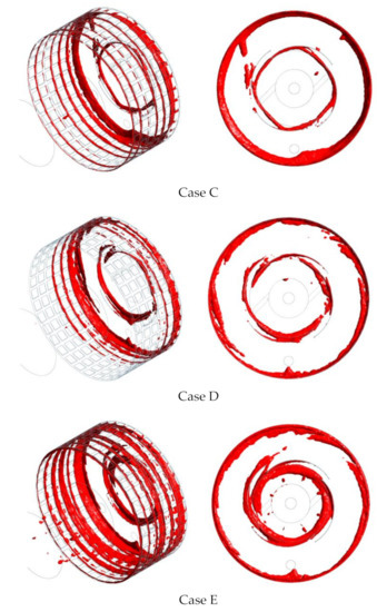 Figure 10 presents the G-acceleration as a function of the radial distance. The corresponding average centrifugal force for cases “C”, “D”, and “E” is 81, 133, and 240 g, respectively. The centrifugal force is highest for the case “E” due to major airflow via the tangential inlets of the VC, resulting in high tangential velocities. This leads to a significant volume fraction of particles being radially pushed outwards to the periphery of the VC, causing high momentum transfer between the gas phase and particles, as presented in Figure 11, depicting the iso-surfaces of volume fraction at a value of 5 × 10−4. Here, the particles are instantly separated from the central axial hot airflow and entrained into the VC to form a rotating particle bed. In case “E”, the peripheries of the VC are almost completely occupied with the particles, while in case “C” and “D”, the G-acceleration is not sufficient to separate the particles efficiently. Therefore, the particles tend to move axially toward either of the end walls—front or back. Consequently, in case “C” and “D”, particles rotate adjacent to the back wall. In case “E”, it can be seen that a relatively large amount of particles are separated and rotate in the center of the chamber. This is because the tangential velocities are maximal in the central two wheels.