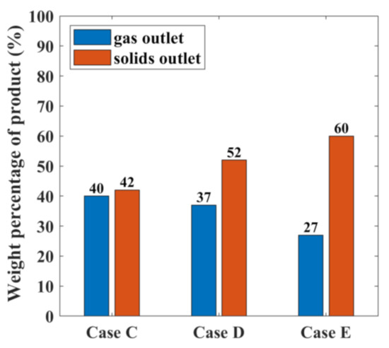 Comparison of weight percentage (%) of product recovered at the outlets for cases C–E.
