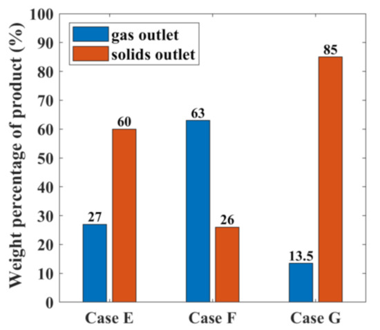 Comparison of weight percentage (%) of product recovered at the outlets for cases E–G.