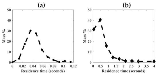 Residence Time Distribution (RTD) of particles leaving the dryer in case “F”: (a) via gas outlet; (b) solids outlet.