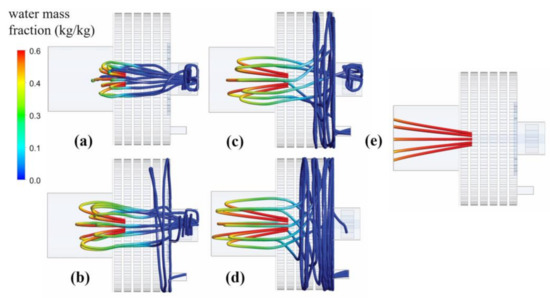 Droplet trajectories for case “F:” (a) initial droplet sizes < 30 µm; (b) 30–45 µm; (c) 45–60 µm; (d) 60–75 µm; and (e) >75 µm.