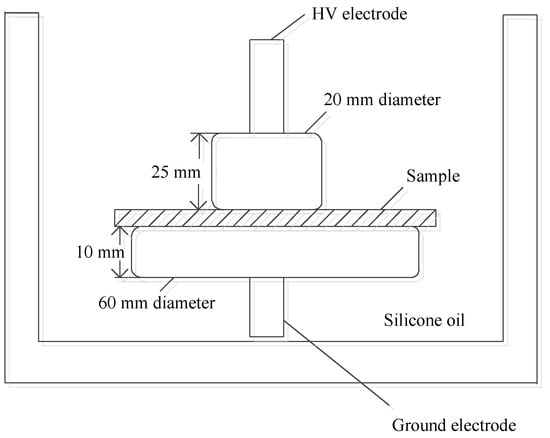 According to the Chinese standard GB/T1408.1-2005, the power frequency AC breakdown performance of each sample was tested by plate–plate electrode, as shown in Figure 1. The diameter and height of the upper electrode were 20 mm and 25 mm, respectively. The diameter and height of the lower electrode were 60 mm and 10 mm, respectively. The edges of the electrodes were rounded and the radius was 2 mm. The sample thickness was 50 μm. In order to prevent residual charge from affecting the test results, it is necessary to short-circuit each sample to be tested before testing the breakdown field strength. In order to prevent the edge discharge of metal electrode, the sample with thickness of 50 μm and electrode should be immersed in cable oil. In the test, 50 Hz alternating current was used, and the voltage was slowly increased at a speed of 1 kV/s until composites were broken down, and the voltage was recorded. By the formula E = U/D, the corresponding power frequency AC breakdown field strength was calculated, where U is the voltage at the breakdown of the sample, D is the thickness of the sample, and E is the breakdown field strength of each sample.
