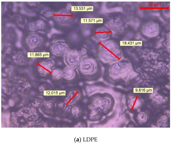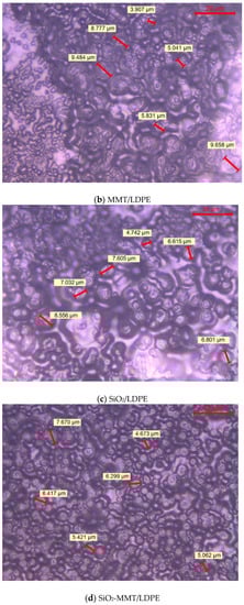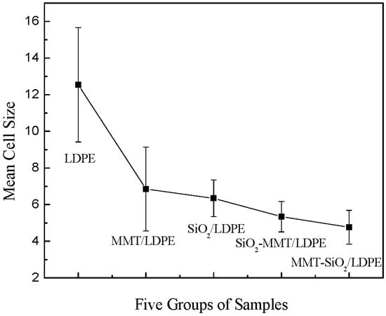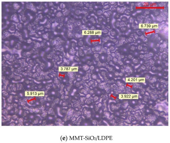 Figure 2 shows the crystalline morphology of each material under PLM after being etched by concentrated sulfuric acid mixed with potassium permanganate. As both the previous writing and the ICHVE 2020 conference were held during the COVID-19 epidemic period, universities were closed, so the crystal cell size of each material was not marked in time [21,22]. Now, the epidemic situation in China is well controlled and universities have been opened. We went back to the laboratory and marked the crystal cell size of each composite material, and the statistical distribution of the crystal cell size of each material was calculated; the results are shown in Figure 3. From Figure 2, the crystal of all materials are spherical structures. It can be seen from Figure 3 the average and standard deviation of cell size of each sample. In Figure 2 and Figure 3, LDPE has the largest crystal cell size, and the crystal cell size varies, the diameter of crystal cell is about 9~19 μm, and the average size is 12.541 μm. After adding MMT into the matrix, the crystal cell size decreases, the average size is 6.849 m, and the crystal cell spacing decreases to some extent. The crystal cell size of composites with SiO2 particles is further reduced, with an average diameter of 6.345 μm, and the crystal cell size of SiO2/LDPE is uniform, but its crystal cell spacing is larger than that of micro–nano composites SiO2-MMT /LDPE and MMT-SiO2/LDPE. The crystal cell size and spacing of SiO2-MMT/LDPE material prepared by the method of adding SiO2 particle first and then MMT particle are further reduced. The diameter of the crystal cell is distributed around 4~8 μm, and the average diameter of the cell is 5.341 μm. The internal structure of the material is tight. The crystal size and spacing of MMT-SiO2/LDPE material prepared by the method of adding MMT particle first and then SiO2 particle becomes smaller than the former, and the crystal cell diameter is distributed around 3~7 μm with the average crystal cell diameter as 4.765 μm. The reason why the crystal cell size of MMT-SiO2/LDPE is smaller than that of SiO2-MMT/LDPE is that the small-sized particle is added first, which makes it easier for the small-sized particles to enter the machine body and play a heterogeneous nucleation role, thus reducing the unit cell size. However, a small-sized particle is added first, and then a large-sized particle is added, which will damage the structure formed by the small-sized particle added first, and weaken the heterogeneous nucleation effect, so the cell size is reduced.