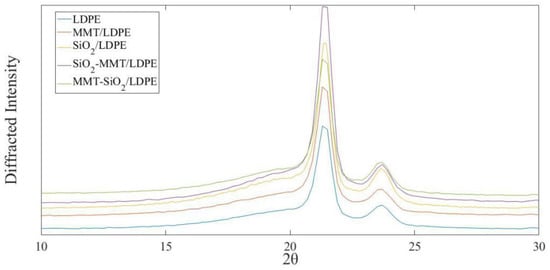According to Table 1, the order of fusion temperature is SiO2/LDPE > MMT/LDPE > SiO2-MMT/LDPE > MMT-SiO2/LDPE > LDPE. The order of crystallinity is SiO2/LDPE > MMT/LDPE > SiO2-MMT/LDPE > MMT-SiO2/LDPE > LDPE. The increase in the crystallinity of the sample is due to heterogeneous nucleation after doped particles. The heterogeneous nucleation of SiO2 with smaller particle size is obvious, and the crystallinity of SiO2/LDPE material has a larger increase. During the experiment, the addition order of micro- and nanoparticles was changed to research the crystallinity of micro–nano composite materials. According to the order of adding the SiO2 particle first and then the MMT particle, the crystallinity of SiO2-MMT/LDPE composites are weaker than that of the composites with only SiO2 particles. This is result of the large size of the MMT particles; the addition of MMT particles will squeeze the composite materials crystalline structure of samples, which will change the crystalline structure of the sample. Furthermore, the addition of MMT particles will cause expansion of the original crystal area, and the new structure may increase the hindrance to the movement of molecular chains. According to the order of adding the MMT particle first and then the SiO2 particle, the crystallinity of MMT-SiO2/LDPE composites are weaker than the SiO2-MMT/LDPE composites. This is because the size of the MMT particle is larger than the SiO2 particle. In the preparation of micro–nano composites, small particles added later are harder to squeeze into the matrix than large ones. Simultaneously, the composites filled with particles may add multiple heat conduction channels, which significantly improves the fusion temperature of the material. Experimental data shows that the smaller the particle size, the more significant the improvement of the fusion temperature. When SiO2-MMT/LDPE is compared with MMT-SiO2/LDPE composite materials, both of them are micro–nano composite materials with two kinds of particles, but the fusion temperature of the former is higher than that of the latter. The reason is that the large-sized MMT particle is added later in the former, and more heat conduction channels will be introduced in composite process than the latter, so that the fusion temperature of SiO2-MMT/LDPE composites is high. However, the particles added later will squeeze the original heat conduction channels, resulting in the fusion temperature of micro–nano composites not being as good as that of adding one particle alone.