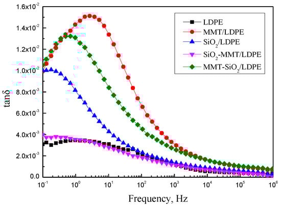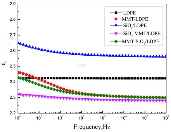 Two major statements for the change of permittivity exist in composites with certain particles. First, the interaction between particles and composites matrix limits the moving of composite macromolecular chains and reduces the polarization of matrix [27,28]. Second, the interfacial polarization would occur in the interface between particles and composites matrix, which will make the value of permittivity rise [29]. Figure 5 and Figure 6 show the variation of εr and t tanδ with f of each sample. In Figure 5 and Figure 6, we can see that LDPE is a non-polar material, the polarization of electron displacement occurs primarily in its interior, and therefore εr is small. At the same time, it does not vary with the frequency. SiO2 particles were added into LDPE, and a number of interfaces will be formed. There will be interface polarization in materials, hence εr and tanδ of SiO2/LDPE are higher than LDPE. As the frequency increases, the electrical fields change gradually faster, and the relaxation polarization is too late to keep abreast of the electrical fields. In consequence, polarization establishment is incomplete, and εr has a downward trend. As stated in the PLM results, MMT/LDPE and MMT-SiO2/LDPE have compact structures. Simultaneously, on account of the especially stratified structure of MMT, segment activity and polarization establishment of composite materials are not easy. As a consequence, the value of their dielectric constant is small. The structure of SiO2-MMT/LDPE restricts severely the movement of macromolecular chains, and as a result, the εr and tanδ values of SiO2-MMT/LDPE are at low levels in five materials.