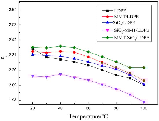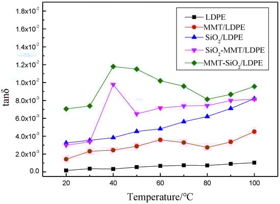Figure 7 and Figure 8 show the changes of εr and tanδ with T of the five samples, and the test frequency is 50 Hz. It is observed that the dielectric constant of composites reduces with the increment of temperature. This is because of the intensification of molecular thermal motion, which results in directional polarization difficulty. When a micro–nano particle is introduced into the matrix, interface areas will appear, hindering the thermal motion of molecular chains under high temperature, and therefore dielectric constant and loss of composites will raise. Nevertheless, SiO2-MMT/LDPE could ruin the original interface areas with adding of small-size fillers first, and then large-size fillers. As a result, interfacial regions have less obstruction to molecular chains’ thermal movement under high temperature, and dielectric constant of composites decline accordingly. As the increment of temperature, the loss is chiefly decided by the conductance loss, and tanδ increases along with temperature. Since the main components in MMT are SiO2, Al2O3, and H2O, after introducing MMT particles into composites, lots of interfaces formation. Relaxation polarization has a great influence under low temperature and relaxation loss is large. Therefore, the loss of composites with MMT increases first, and then decreases with the temperature rises.
