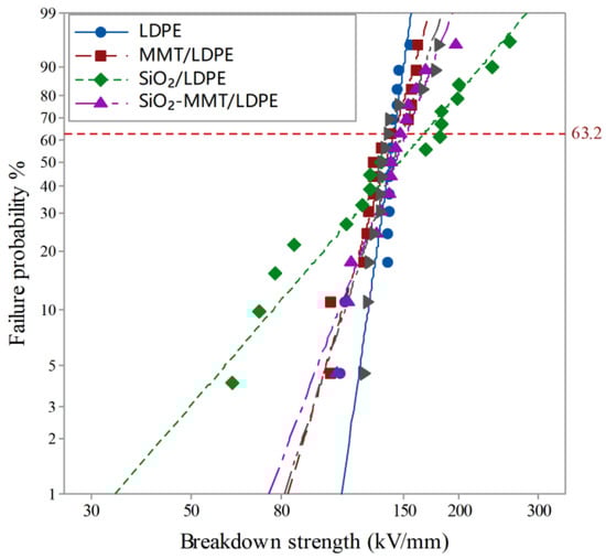 The Weibull distribution analysis of breakdown field strength data of each sample measured by the experimental device in Figure 1 was analyzed by MINITAB software; 15 samples were measured for each material, and the results are shown in Figure 9.