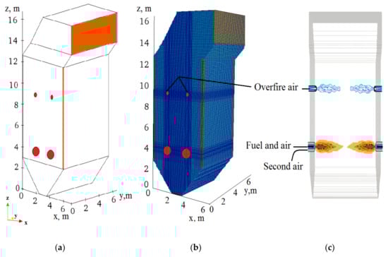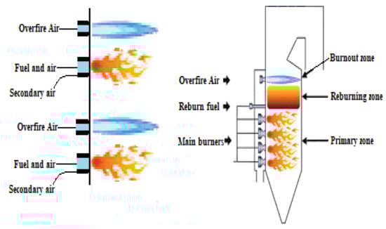 20]. The implementation of two-stage fuel combustion is carried out by installing secondary and even tertiary air holes above the main combustion zone. In this case, a reduction and afterburning zone is formed in the furnace (see