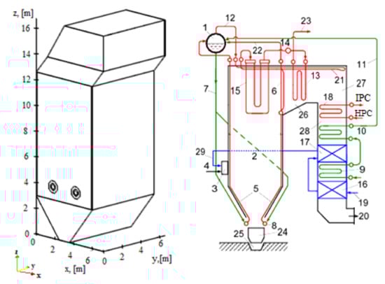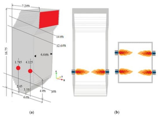21]. The boiler is equipped with four pulverized coal burners, installed two burners from the front and rear in one tier.